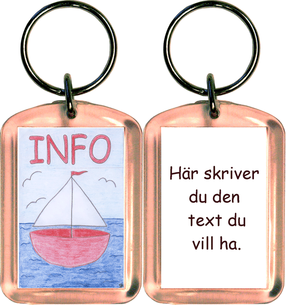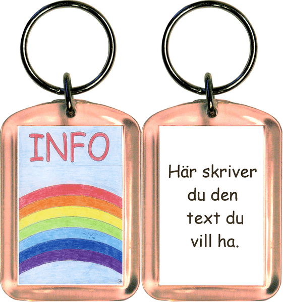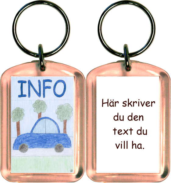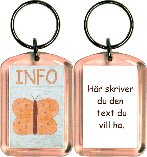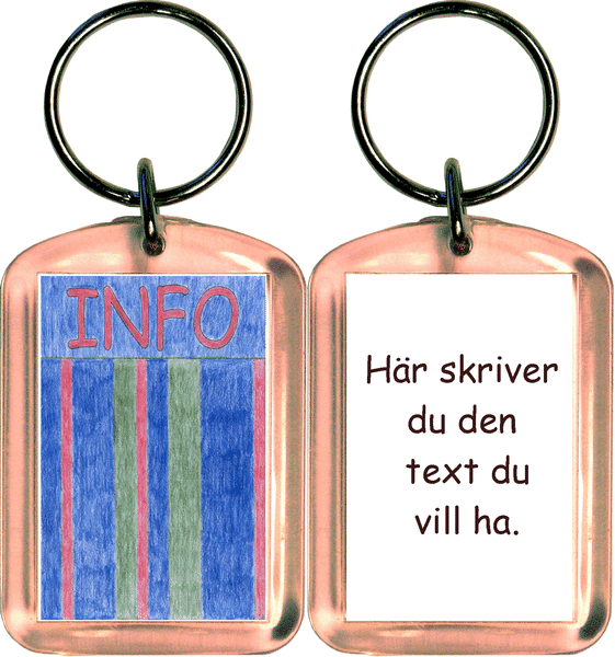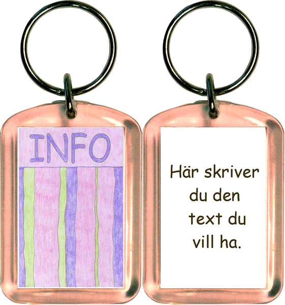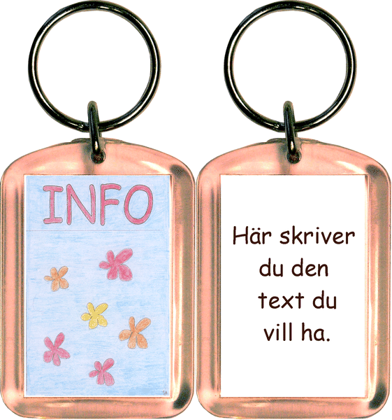 INFO-brickan är tillverkad av transparent plast, och tål regn och rusk. Mått: 4,7 x 3,2 cm (exklusive ringen).