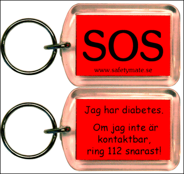 Har du diabetes? Vad händer om du får en insulinkänning på allmän plats? Finns något väl synligt meddelande så att en hjälpande person vet vad som är fel, och hur han kan hjälpa dig? Med vår SOS-bricka för diabetiker kan en medmänniska lättare ge rätt hjälp, och även kalla på ambulans om det skulle behövas. Diabetes-brickan levereras med förtryckt baksida enligt bild.